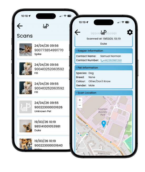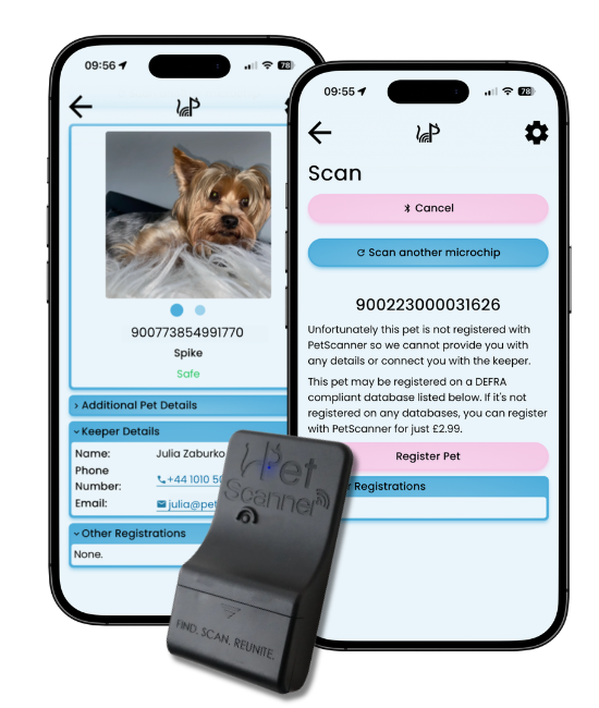 - If a pet is registered with PetScanner, it will display the keeper’s name, email and contact number so they can be contacted instantly.